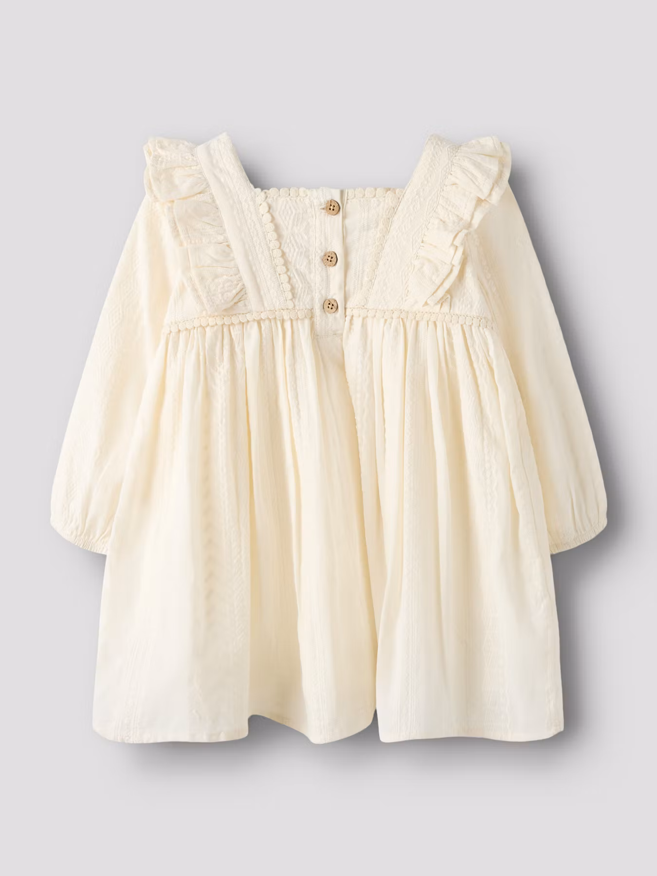 Otroligt söt och stilren klänning för alla tillfällen. Klänningen har långa ärmar med elastiska muddar samt fina detaljer med broderi, volanger och vackra träknappar i ryggen. Ett måste i höstens festgarderob.
