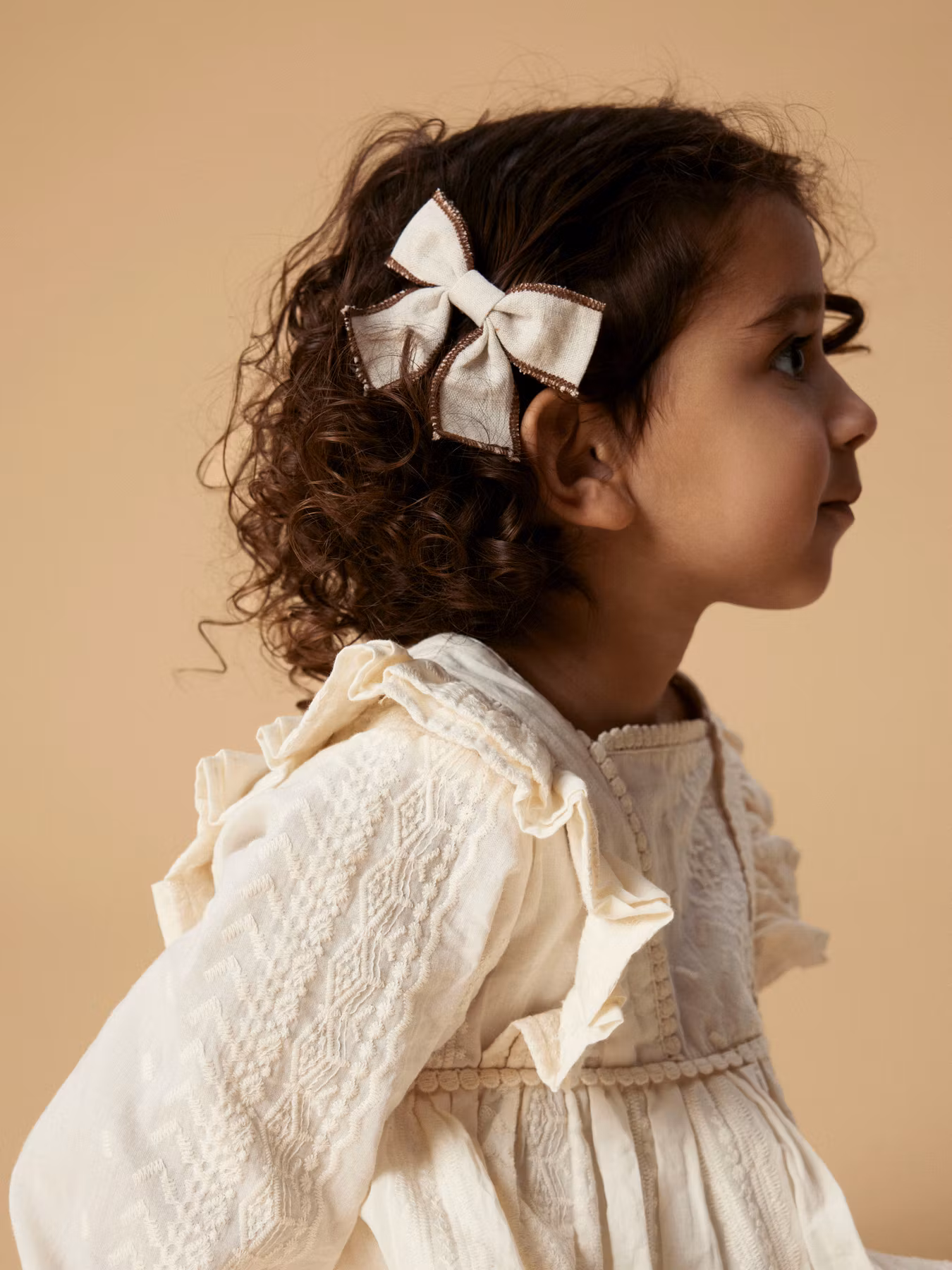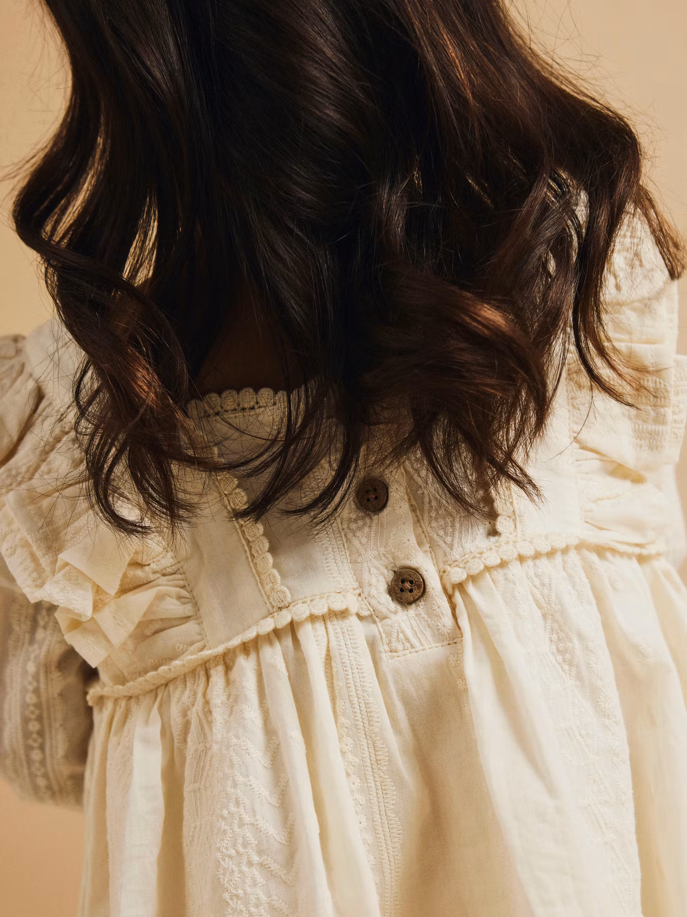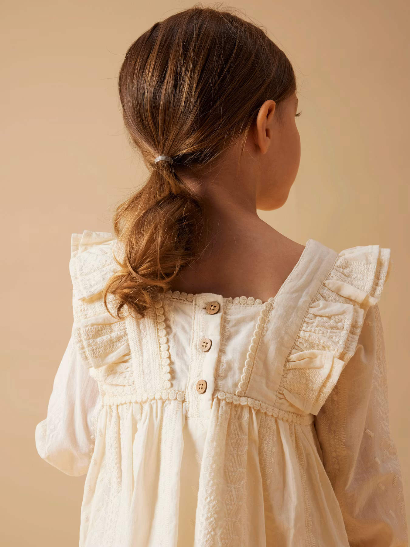 Drömmig klänning med fina broderier, volanger och vackra träknappar i ryggen. Självklar favorit i barnets festgarderob.
