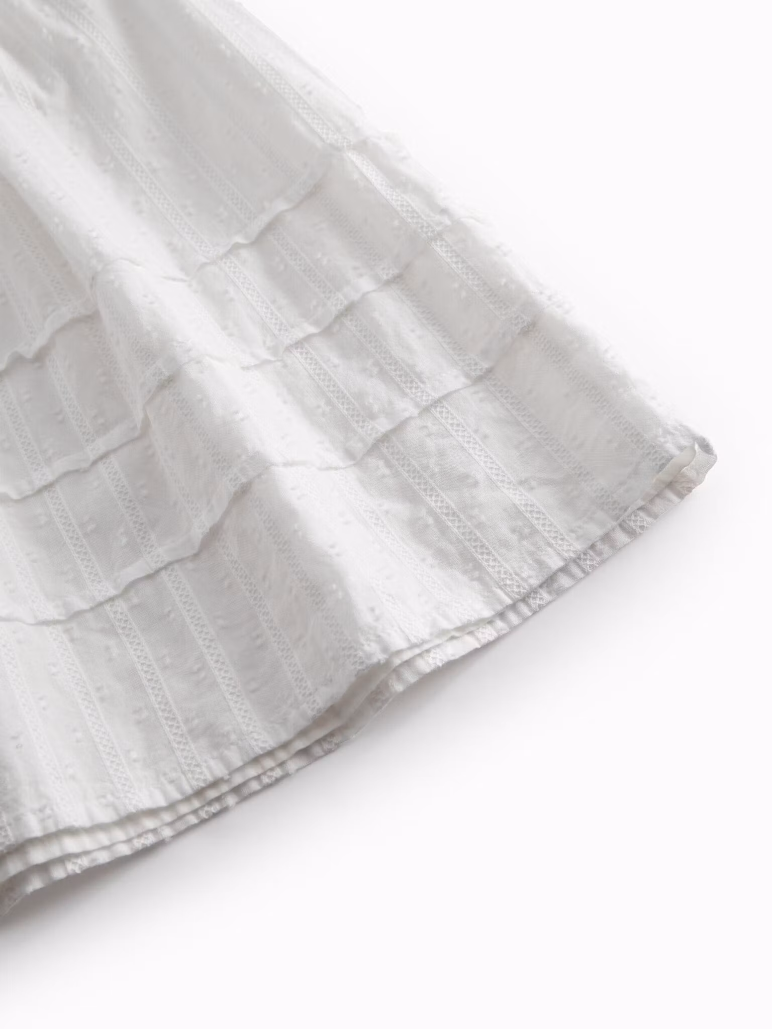 Underbar klänning i 100% bomull, med vacker struktur i tyget. Klänningen har puffärmar och en lätt rynkad överdel. En tidlös favorit i garderoben!