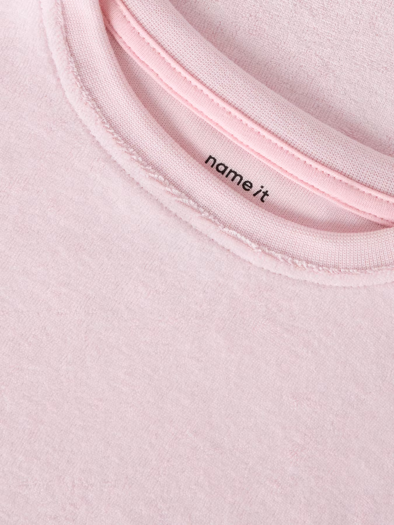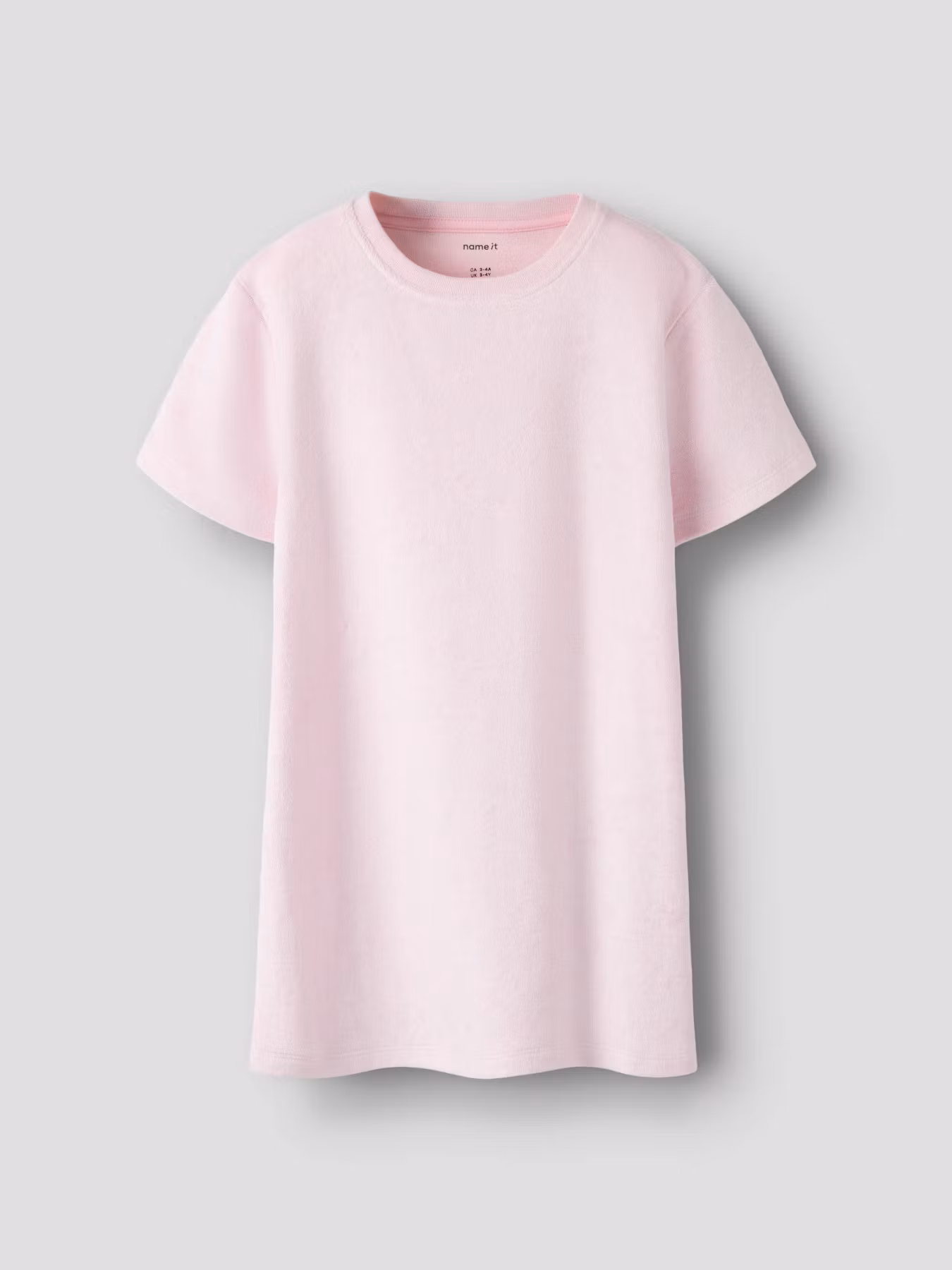 Underbar t-shirtklänning i frotté från Name it. En enkel dra på klänning som är så skön och mjuk, med en härlig ljusrosa färg. En riktig sommarfavorit!
