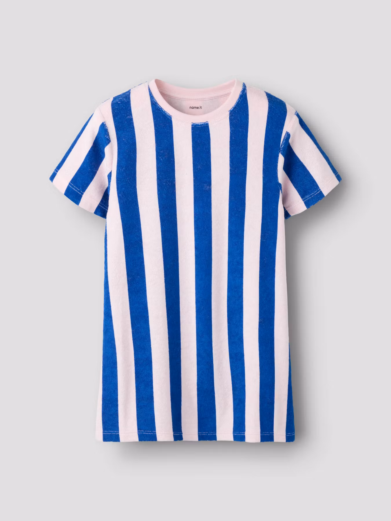 Underbar t-shirtklänning i frotté från Name it. En enkel dra på klänning med härliga blå och rosa ränder. En riktig sommarfavorit!