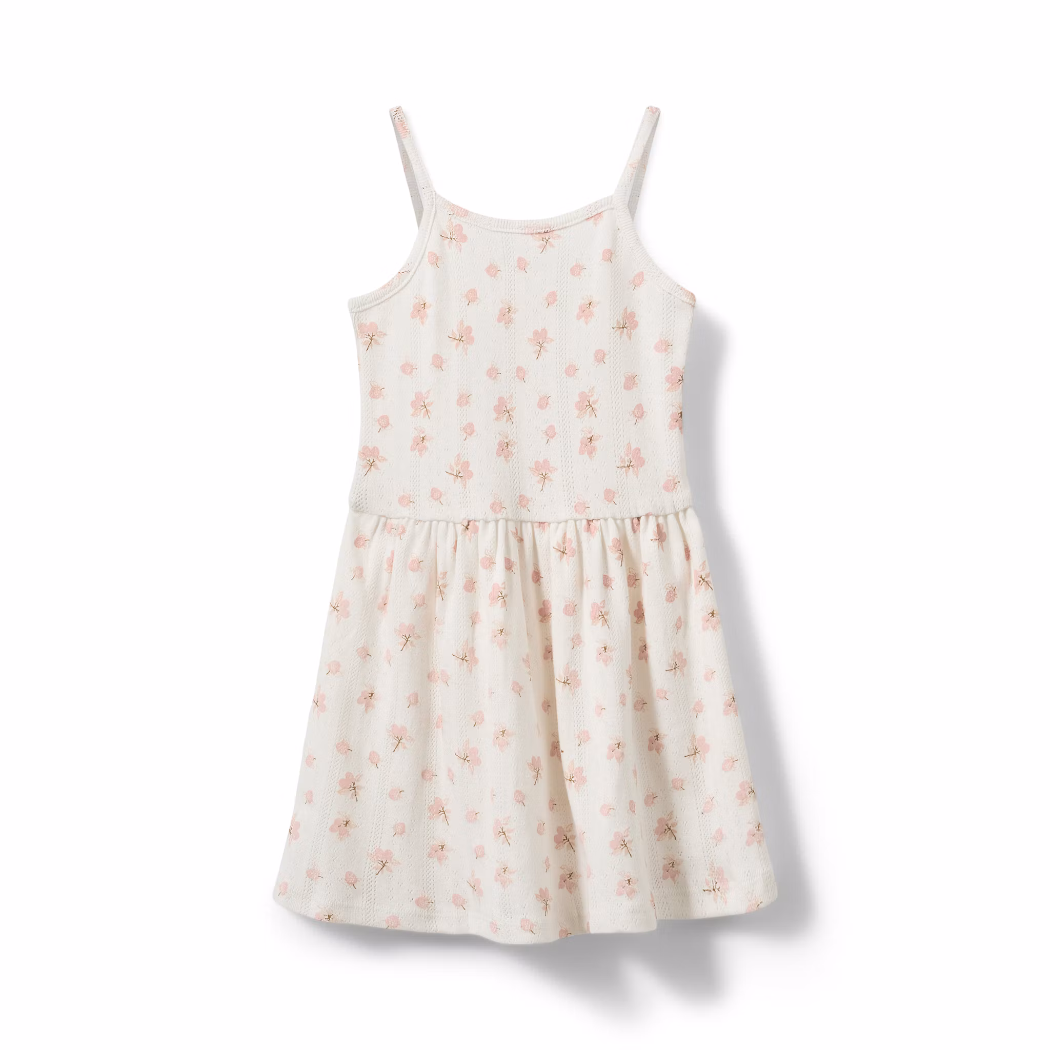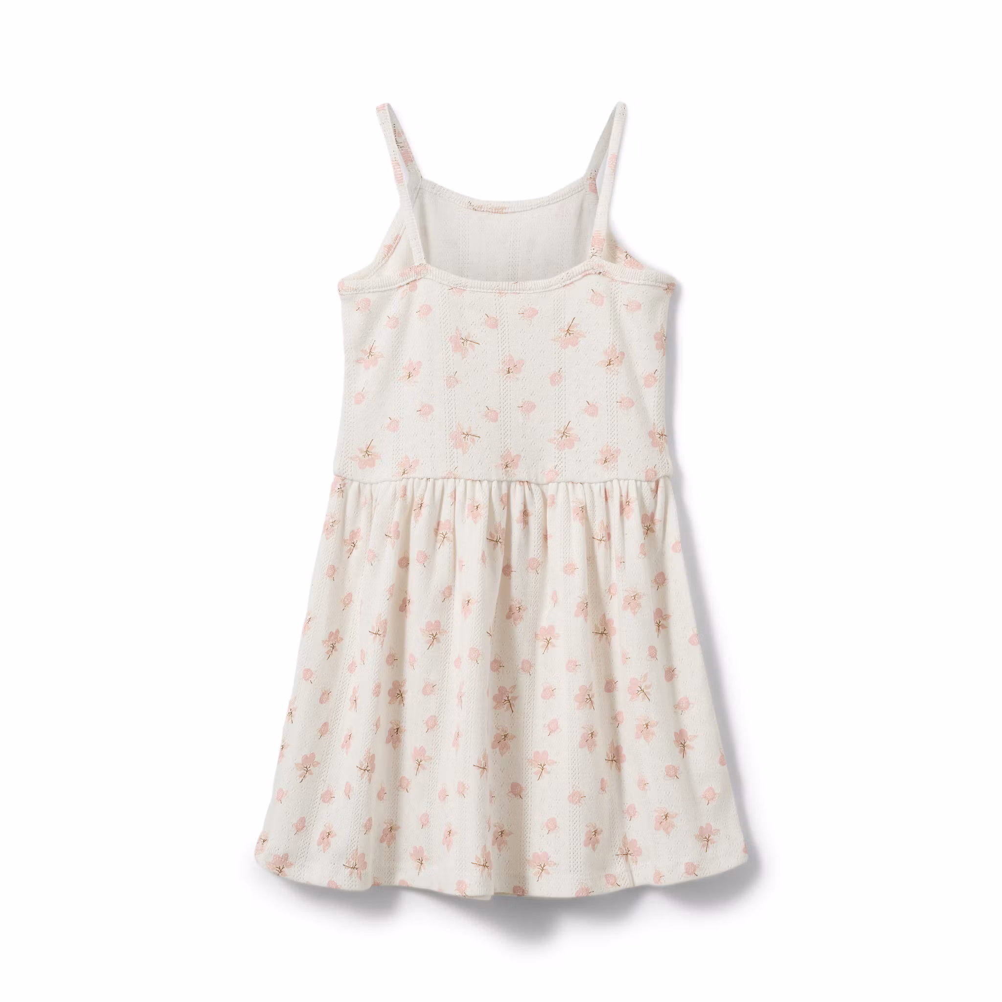 En söt bomullsklänning med rosa blomprint och diskreta pointelle detaljer i tyget. Tunna axelband och skärning i midjan med lätt rynkad nederdel som ger ett mjukt fall. Lika fin till vardag som till säsongens festligheter.