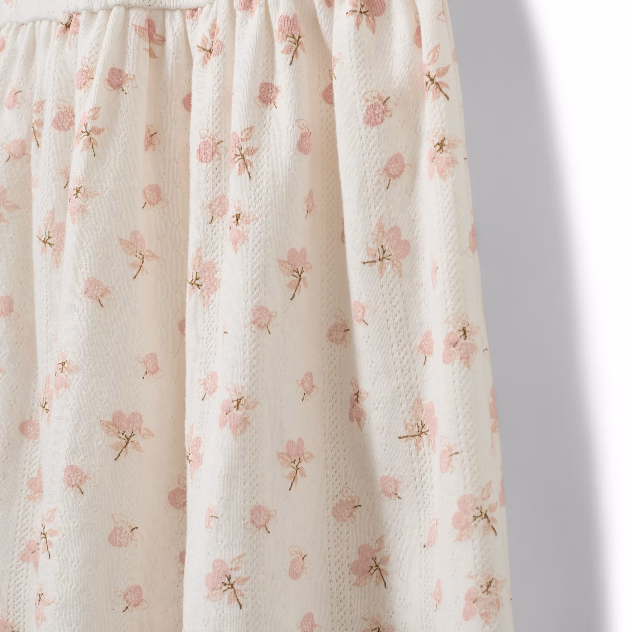 En söt bomullsklänning med rosa blomprint och diskreta pointelle detaljer i tyget. Lika fin till vardag som till säsongens festligheter.