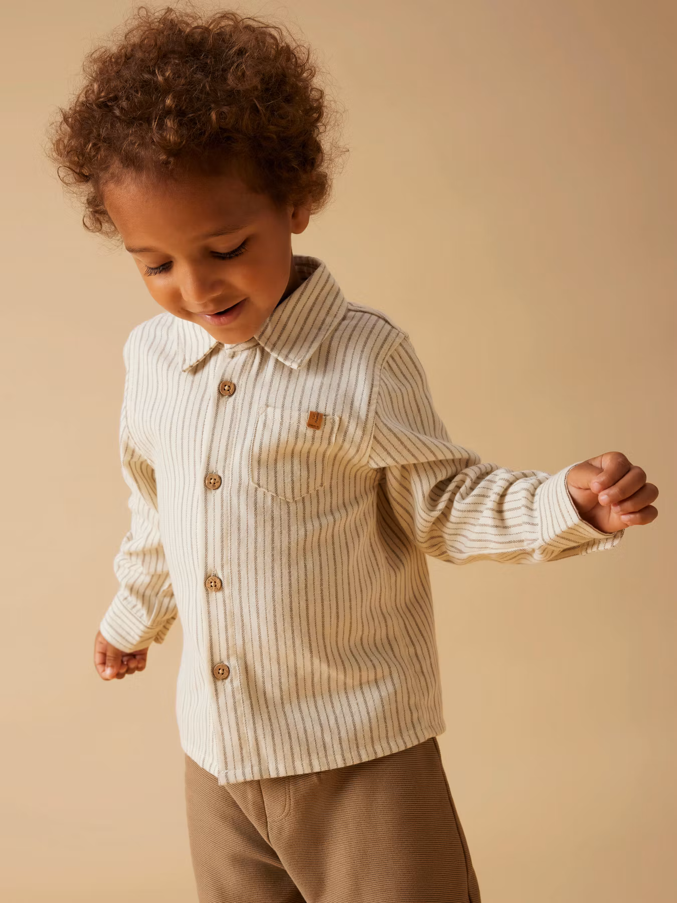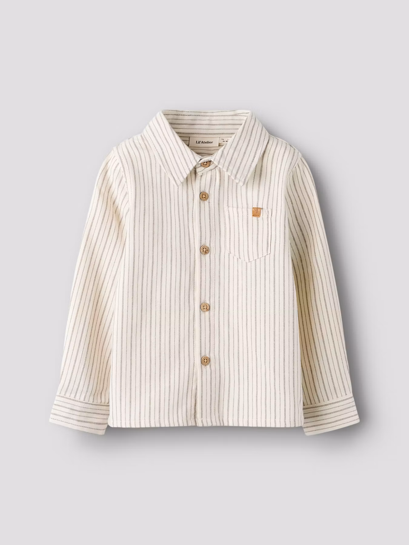 En mjuk tidlös skjorta i randigt gråvitt mönster. Normal passform och stilrena detaljer med träknappar och en liten bröstficka med diskret logopatch. En självklar favorit till höstens alla festligheter.