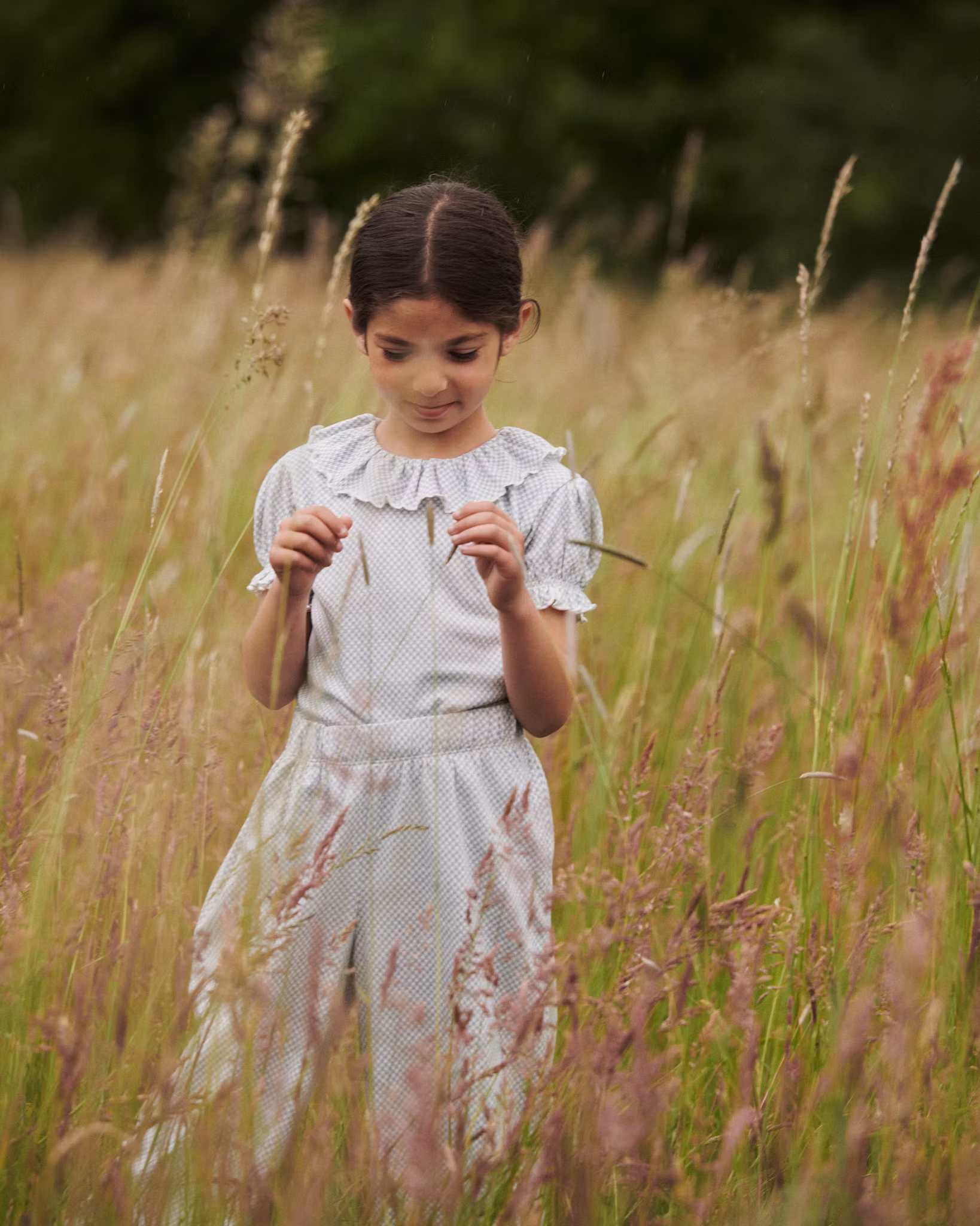 Ett drömmigt set med en söt topp med vacker smårutig struktur och romantiska detaljer tillsammans med 3/4 byxor i 100% ekologisk bomull. Toppen har bred dekorativ krage med vågkant och lätt puffärm. Byxan har vacker struktur i tyget, söt volang i benslut, sidofickor, följsam kvalitet och bekväm resår i midjan. En lös modell som ger fint fall och sköna att bära. Ett självklar favorit i garderoben.