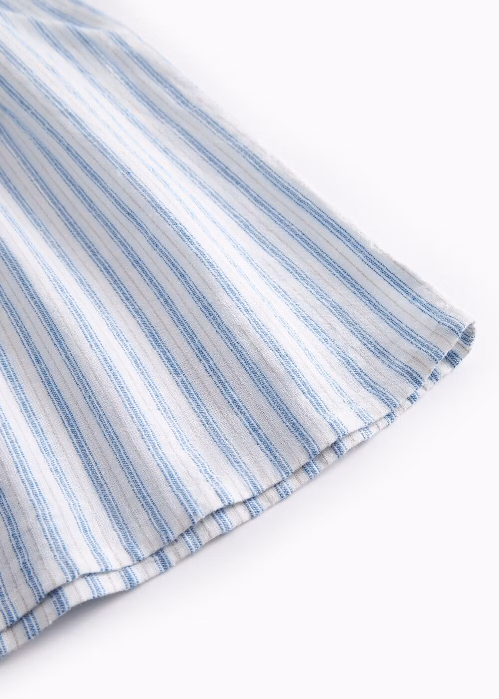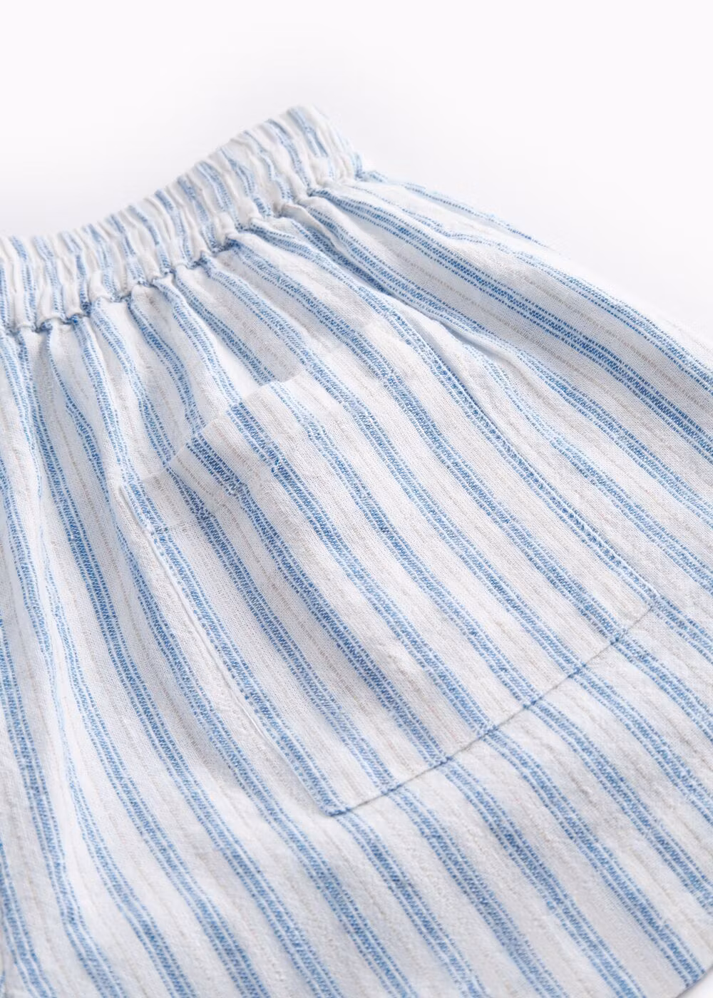 Ett tidlöst randigt set med skjorta och shorts i en mjuk blandning av linne och bomull. Skjortan har krage och knäppning framtill. Matchande shorts med sidofickor och mjuk resår i midjan. En riktig sommarfavorit!