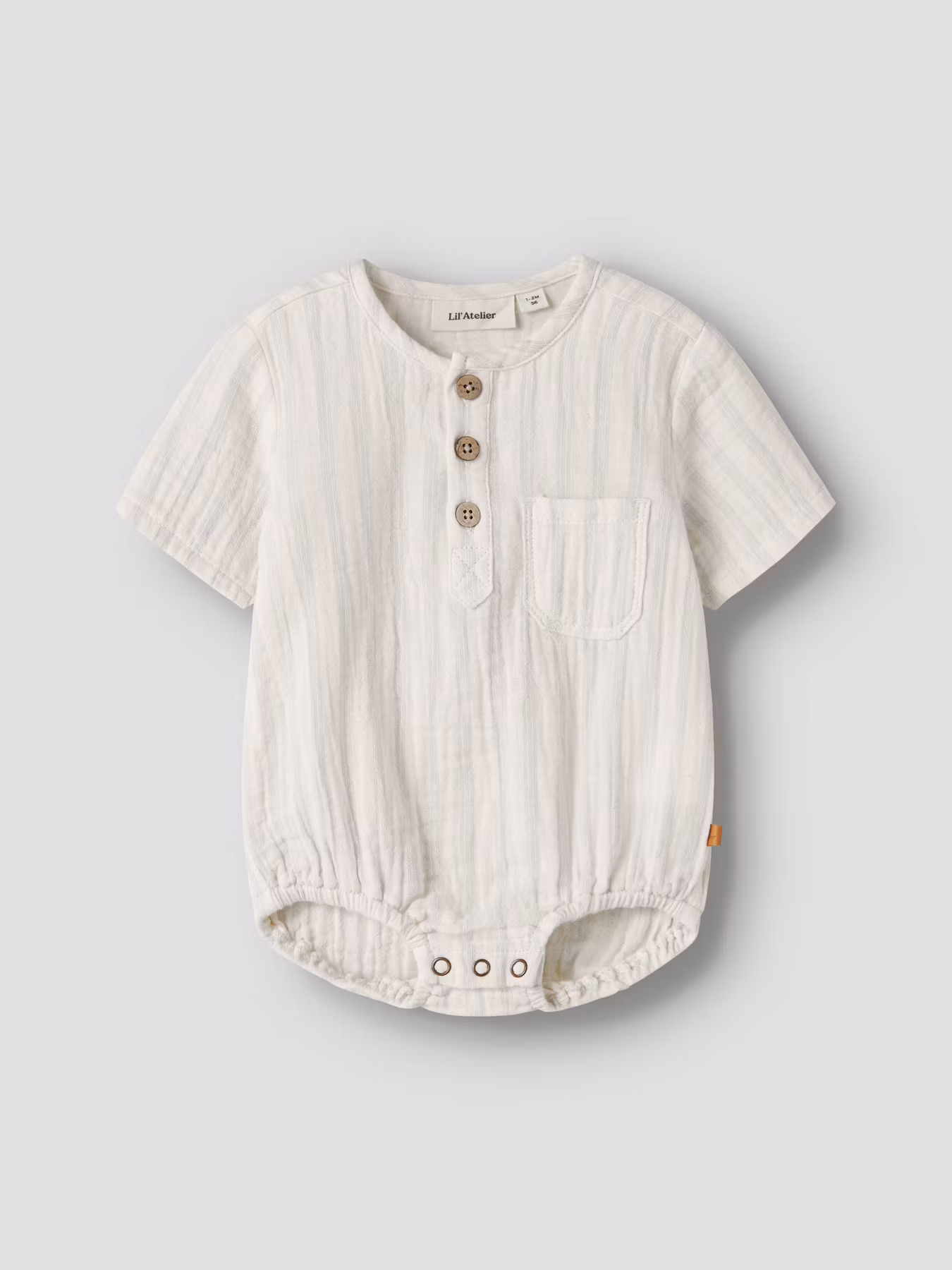 En underbart mjuk och luftig body romper i muslin, som både är bekväm och stilren. Den har praktiska tryckknappar för enkla blöjbyten och lös passform för full rörelsefrihet. En självklar favorit i garderoben.