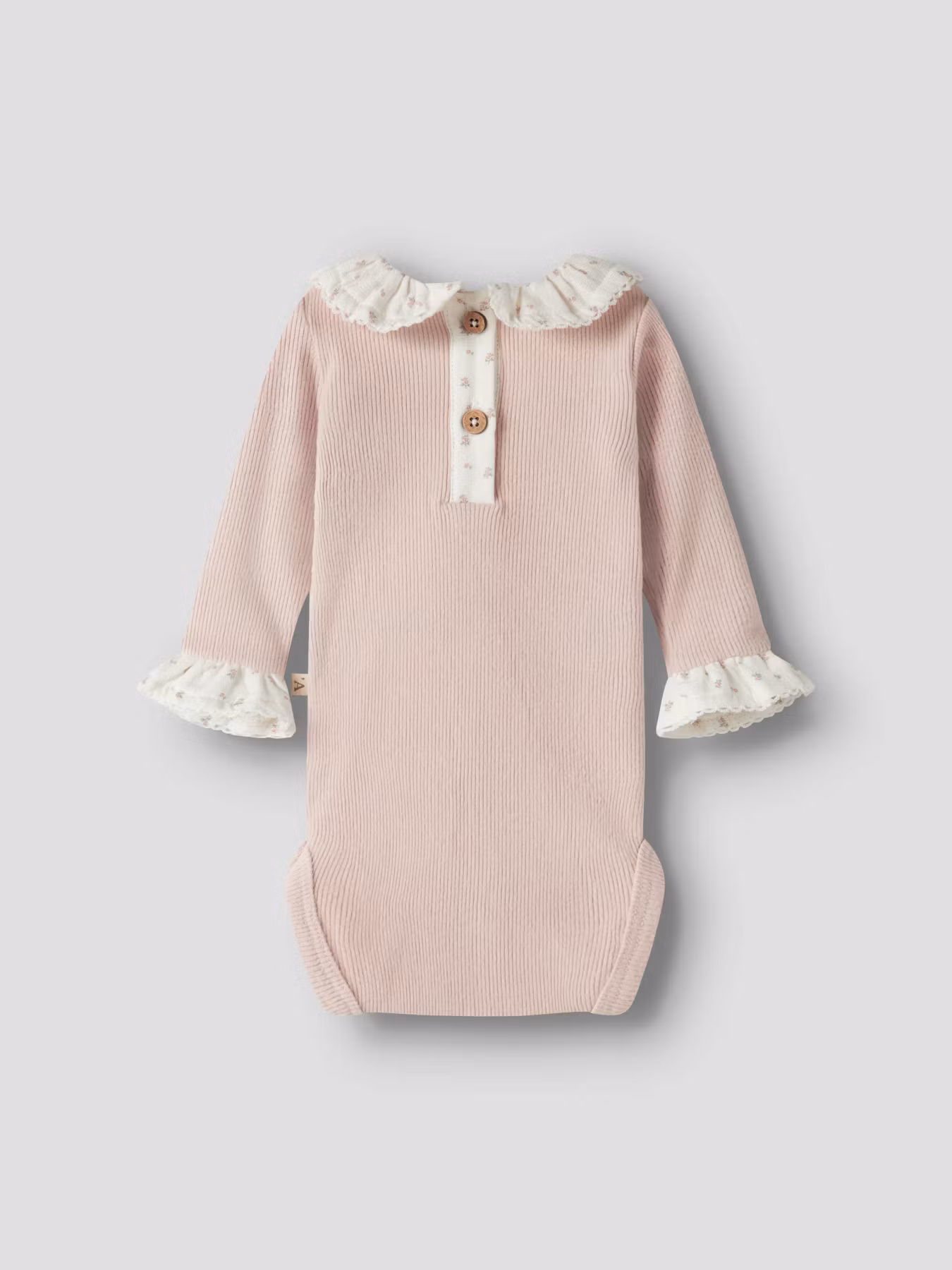 Drömmig body med volangkrage och volang i ärmslut. Materialet är otroligt lent mot huden, nästan sammetsmjukt och följer barnets rörelse tack vare den sköna stretchen. Den ribbade kvaliten ger en fin struktur. Ett plagg som kommer kännas extra speciellt i garderoben.