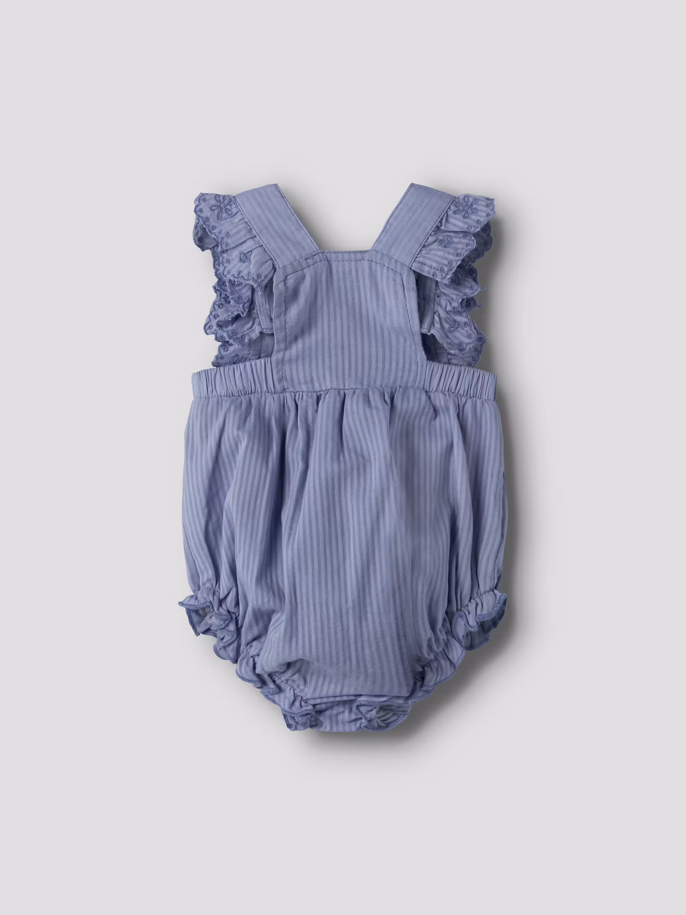 Ljuvlig romber med fina detaljer som gör plagget speciellt. Broderade blommor med volang över axeln. Träknapp framtill samt en extra så längden kan justeras. Resår runt benöppning. Ett underbart sött plagg som blir en självklar favorit i garderoben.