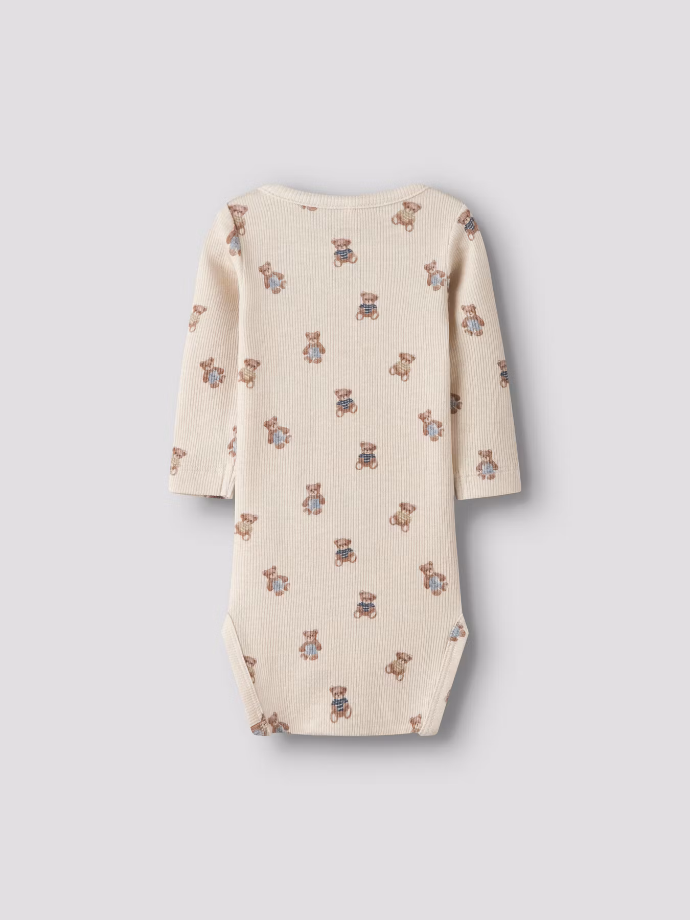 En ljuvlig ribbad body med små nallebjörnar. Tillverkad i en mjuk, följsam kvalitet med stretch som ger en bekväm passform och rörelsefrihet. Bodyn har praktiska tryckknappar i grenen och på axeln som gör påklädning och blöjbyten smidiga. Användbar året runt som en perfekt bas i babygarderoben.