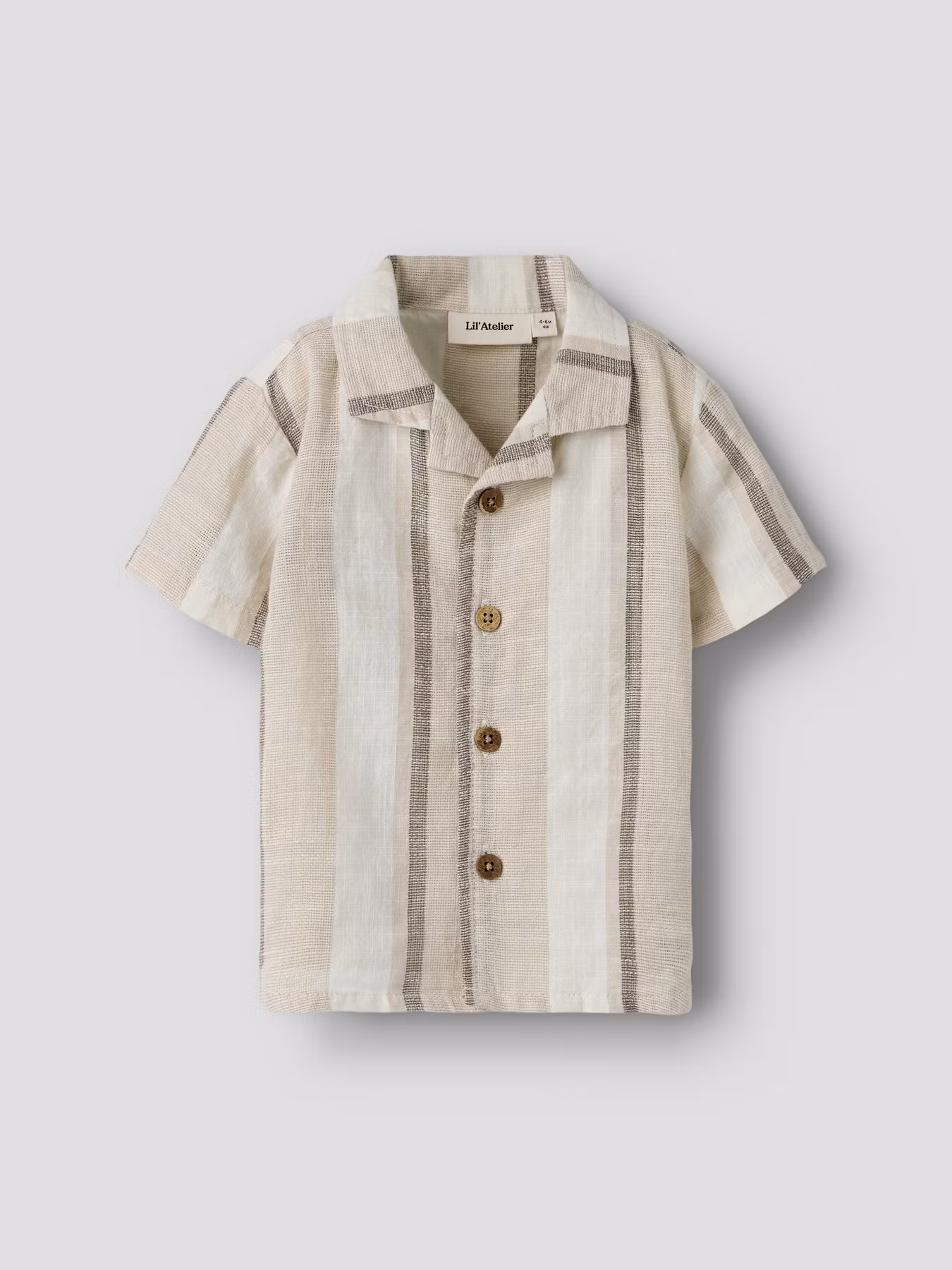 En avslappnad och luftig skjorta med vackra ränder i varma naturtoner. Modellen är något lösare i passformen, har krage, träknappar framtill och kort ärm. Ett plagg som kommer kännas extra speciellt i garderoben.