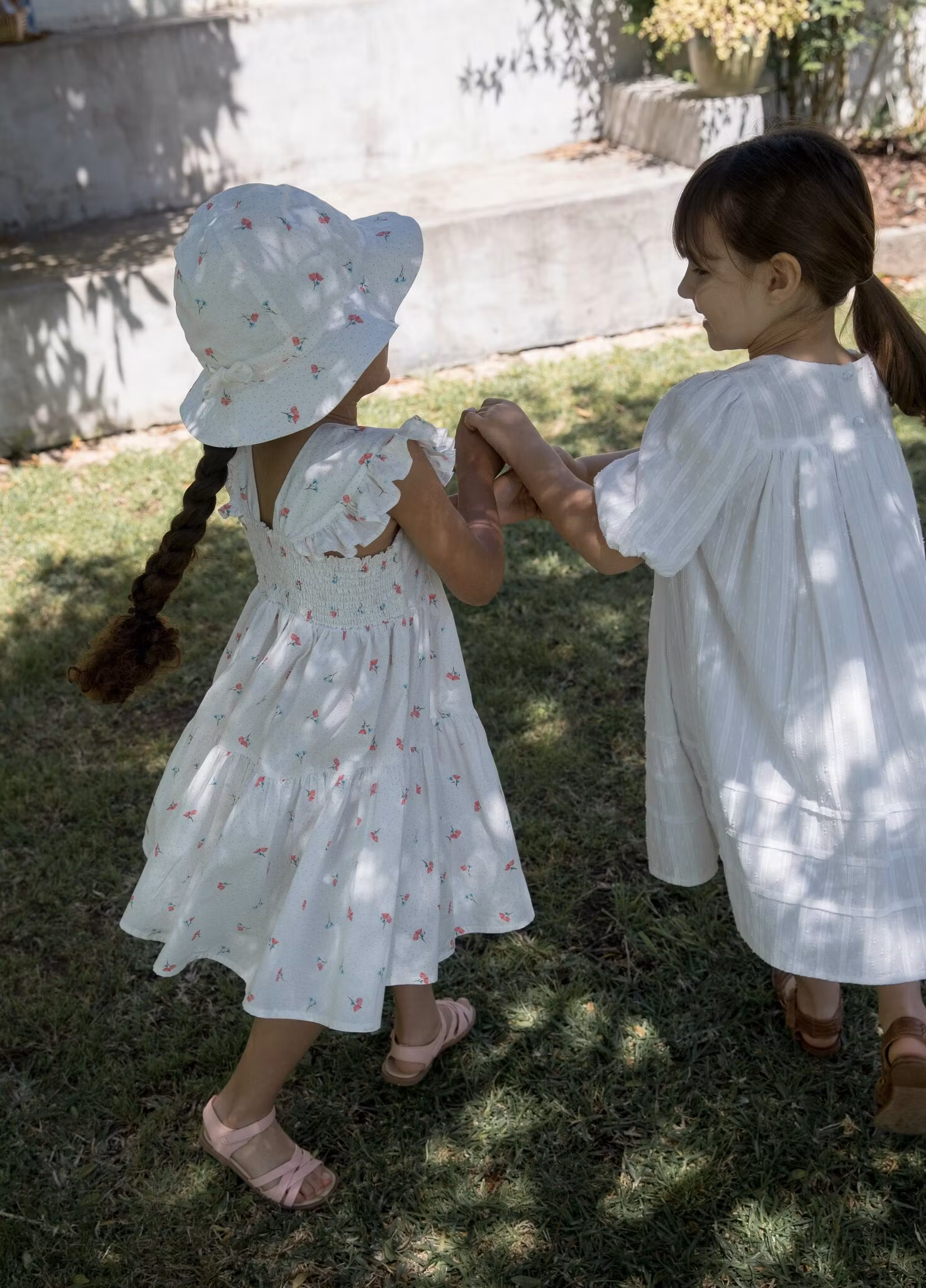 En söt och somrig solhatt med småblommigt mönster. Bred skärm som skyddar mot solen och resår baktill för bra passform. En självklar sommarfavorit!