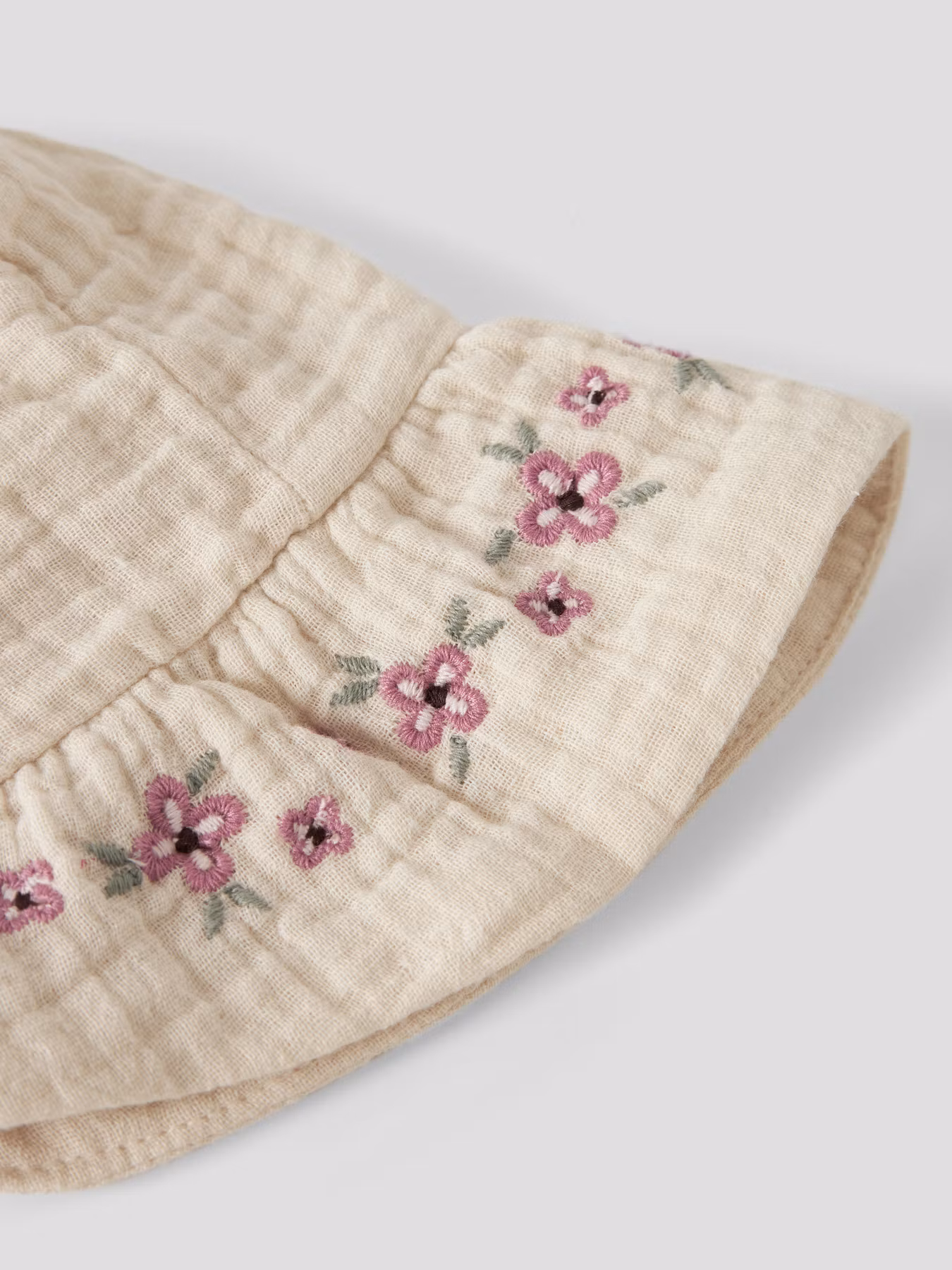 En underbar solhatt i mjuk och luftig muslin. Hatten har en bred skärm som skyddar mot solen och knytband under hakan. Fina broderade detaljer framtill som ger ett sött uttryck. En riktig favorit i sommargarderoben.