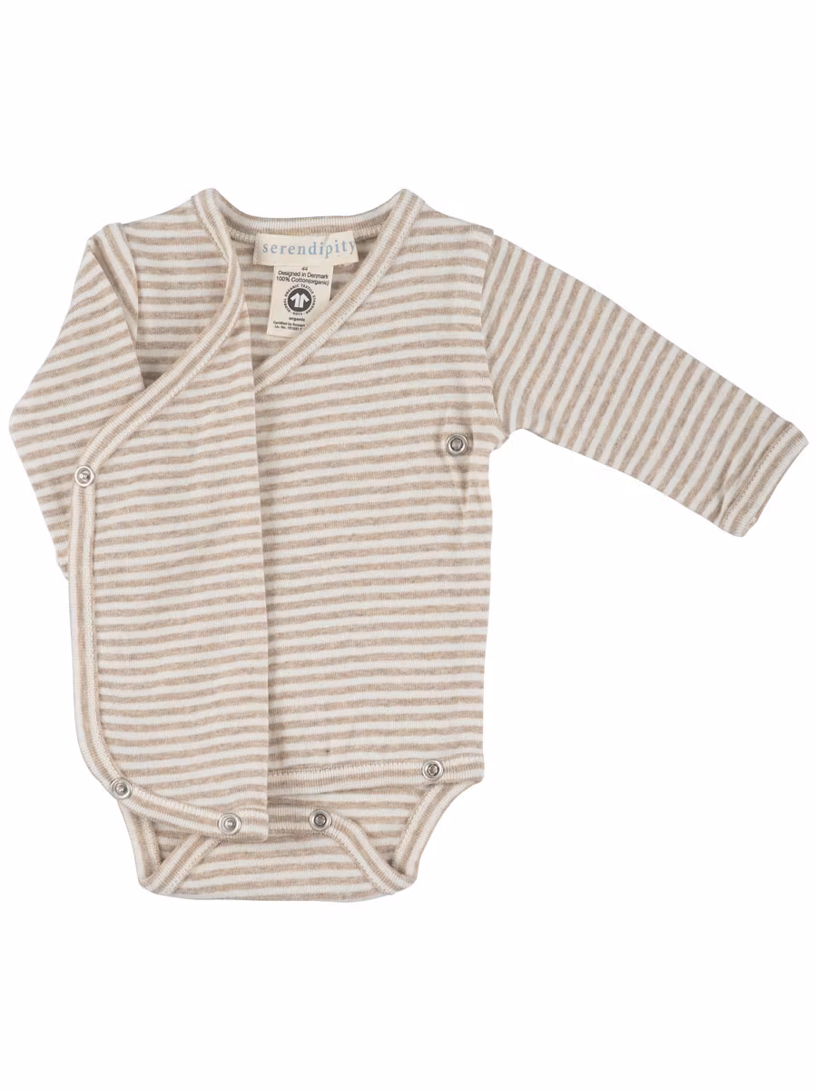 En randig och tidlös omlottbody i offwhite och beige, perfekt för nyfödda. Tillverkad i 100% ekologisk bomull som är skonsam mot känslig hud, är GOTS-certifierad. Praktiska tryckknappar för enkel påklädning. En självklar favorit i första garderoben.